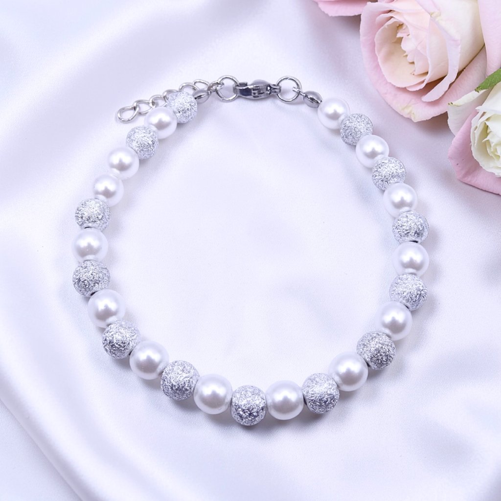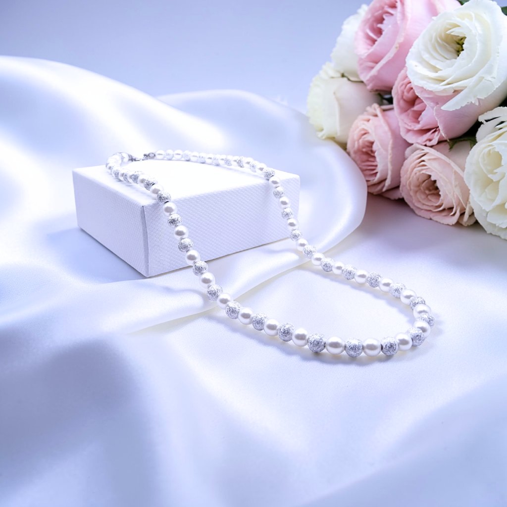 stříbrný šperkový set, dámský náramek a náhrdelník, jemný šperk pro ženy, elegantní korálkový set, perličkový set, dárkový set pro ženy, módní doplňky ženy, stříbrné šperky, jemný náhrdelník a náramek, trendy šperky, chirurgická ocel šperky