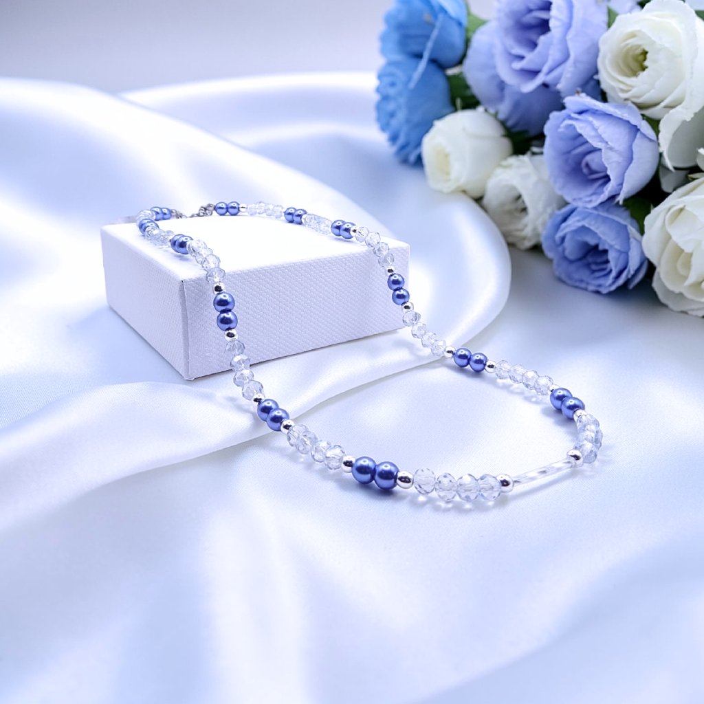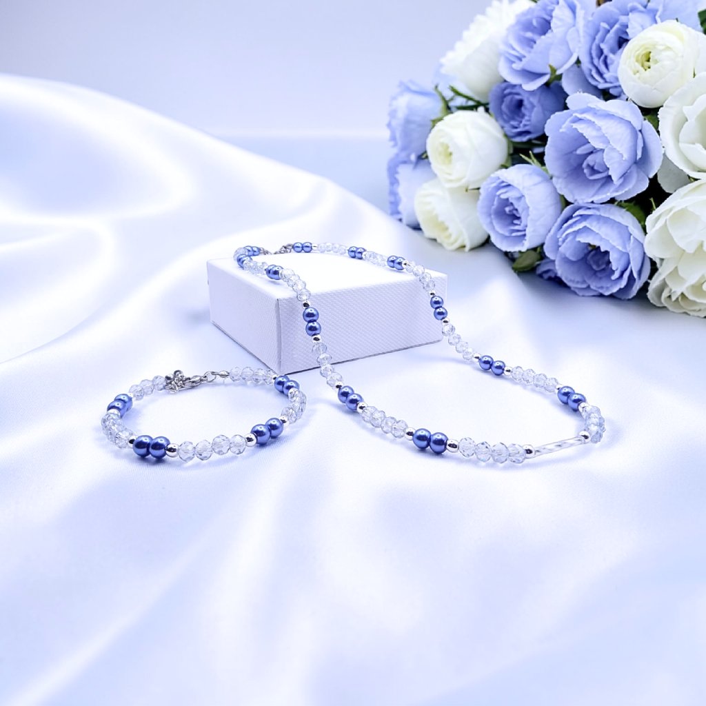 modrý šperkový set, dámský náramek a náhrdelník, jemný šperk pro ženy, elegantní korálkový set, perličkový set, dárkový set pro ženy, módní doplňky ženy, modré šperky, jemný náhrdelník a náramek, trendy šperky, chirurgická ocel šperky