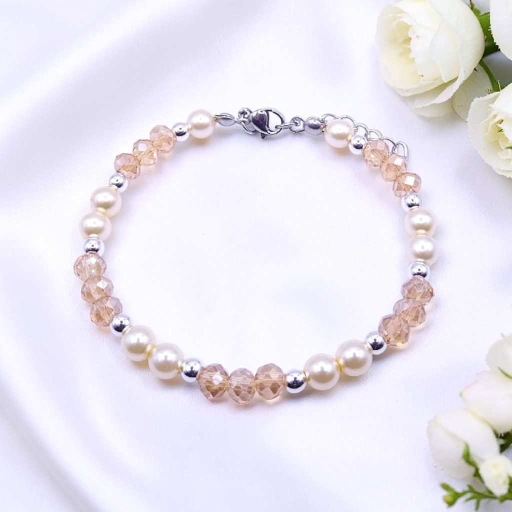 béžový náramek, champagne náramek, dámský náramek, elegantní náramek pro ženy, jemný korálkový náramek, perličkový náramek, dárek pro ženy, luxusní šperk, trendy náramky, šperky z jabloneckého skla