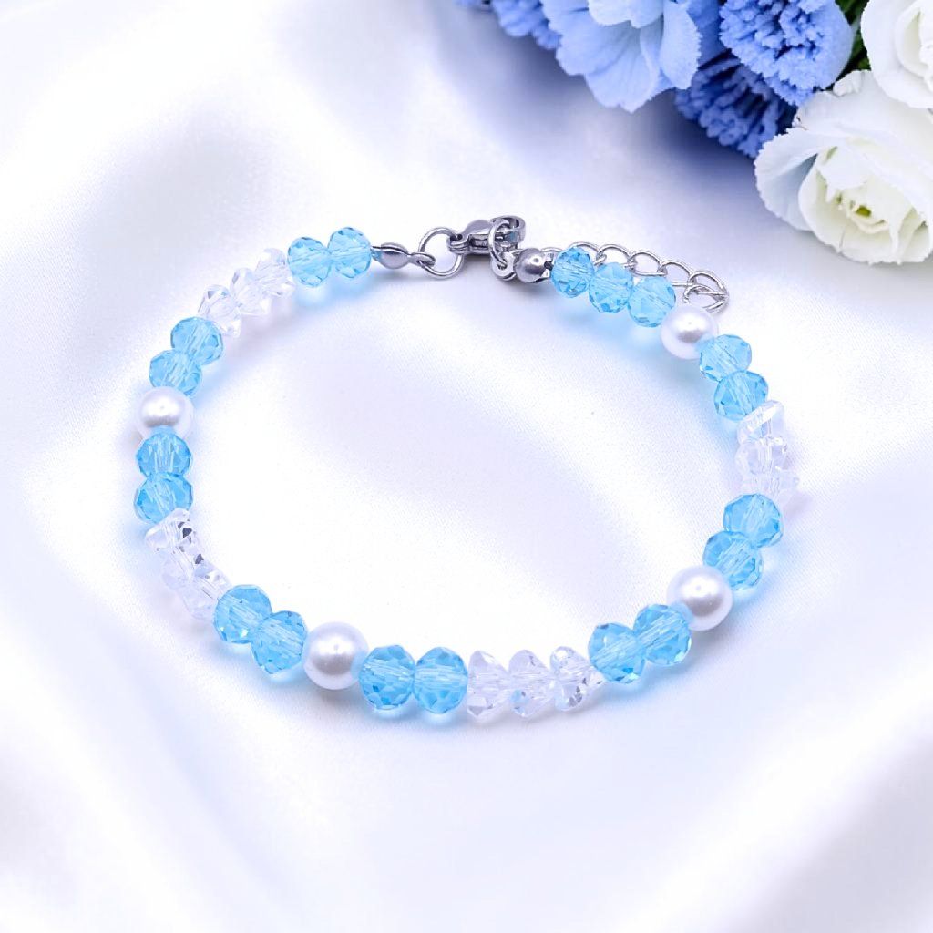 modrý náramek, dámský náramek, jemný náramek pro ženy, elegantní korálkový náramek, perličkový náramek, dárek pro ženy, světle modré šperky, módní doplněk pro ženy, trendy náramky, šperky z jabloneckého skla