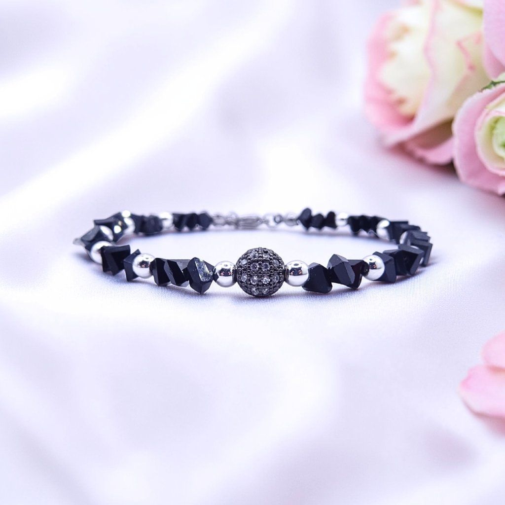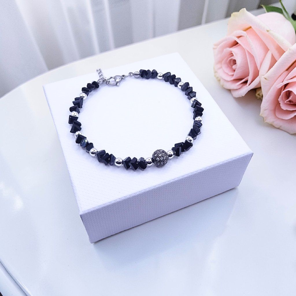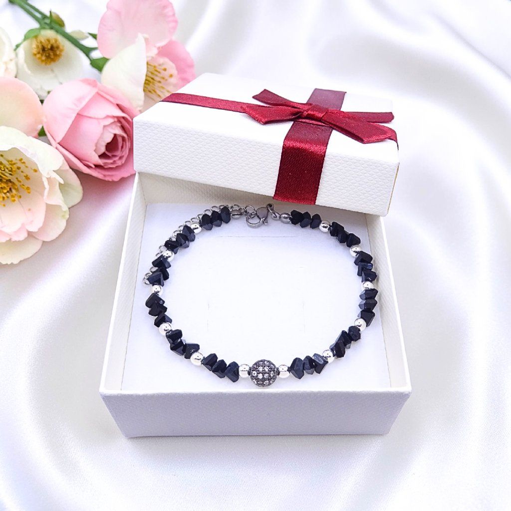 černý náramek, dámský elegantní náramek, luxusní náramek pro ženy, náramek z broušených korálků, stylový dámský šperk, černé šperky, elegantní módní doplněk, trendy náramky, dárek pro ženu, šperky z jabloneckého skla