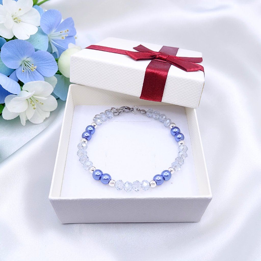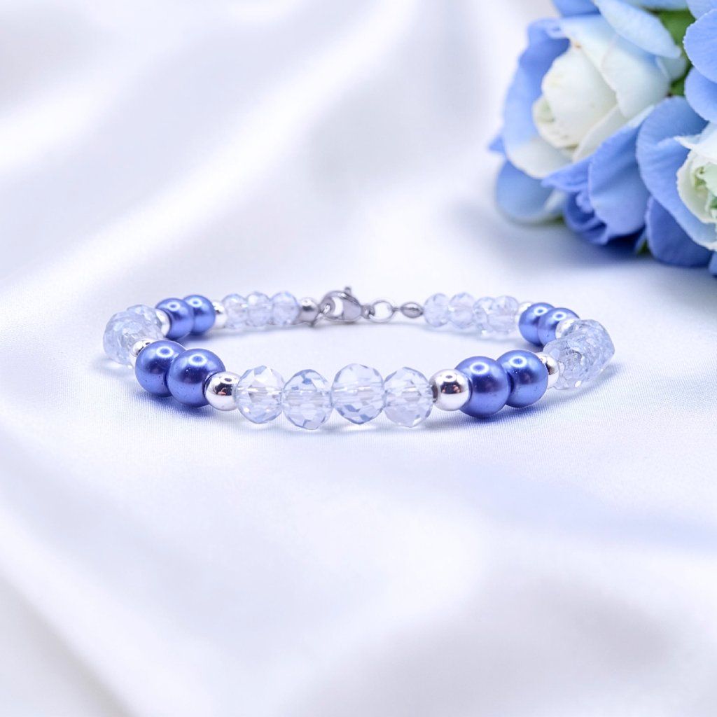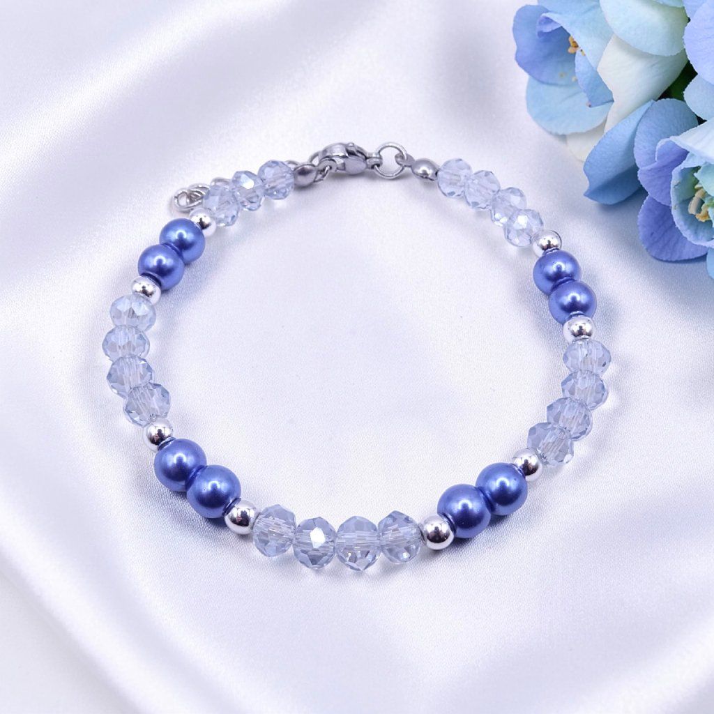 modrý náramek, dámský náramek, elegantní náramek pro ženy, jemný korálkový náramek, perličkový náramek, dárek pro ženy, modré šperky, módní doplněk pro ženy, trendy náramky, šperky z jabloneckého skla