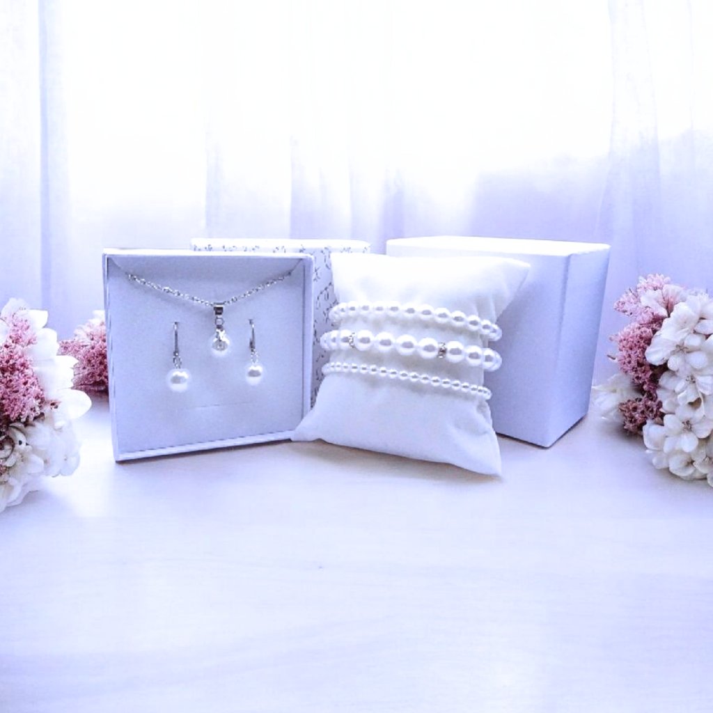 Součástí setu jsou tři perličkové náramky, pár náušnic, řetízek s přívěskem a dvě luxusní dárkové krabičky, které společně tvoří harmonický a dokonale sladěný celek.