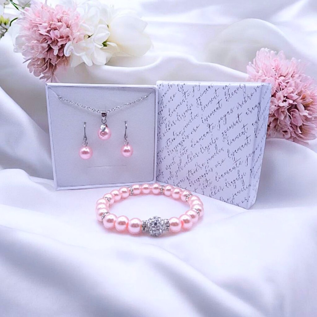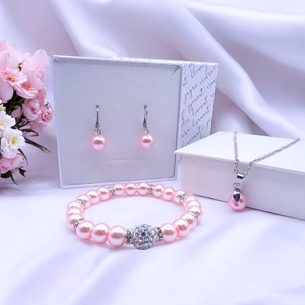 růžová sada šperků, sada z perliček, dámská sada náušnice náramek náhrdelník, elegantní perlová sada, dárková sada pro ženy, šperky z chirurgické oceli, růžový náhrdelník a náramek, dárkový set pro ženu, třídílná sada šperků, perlový dárek pro ženu