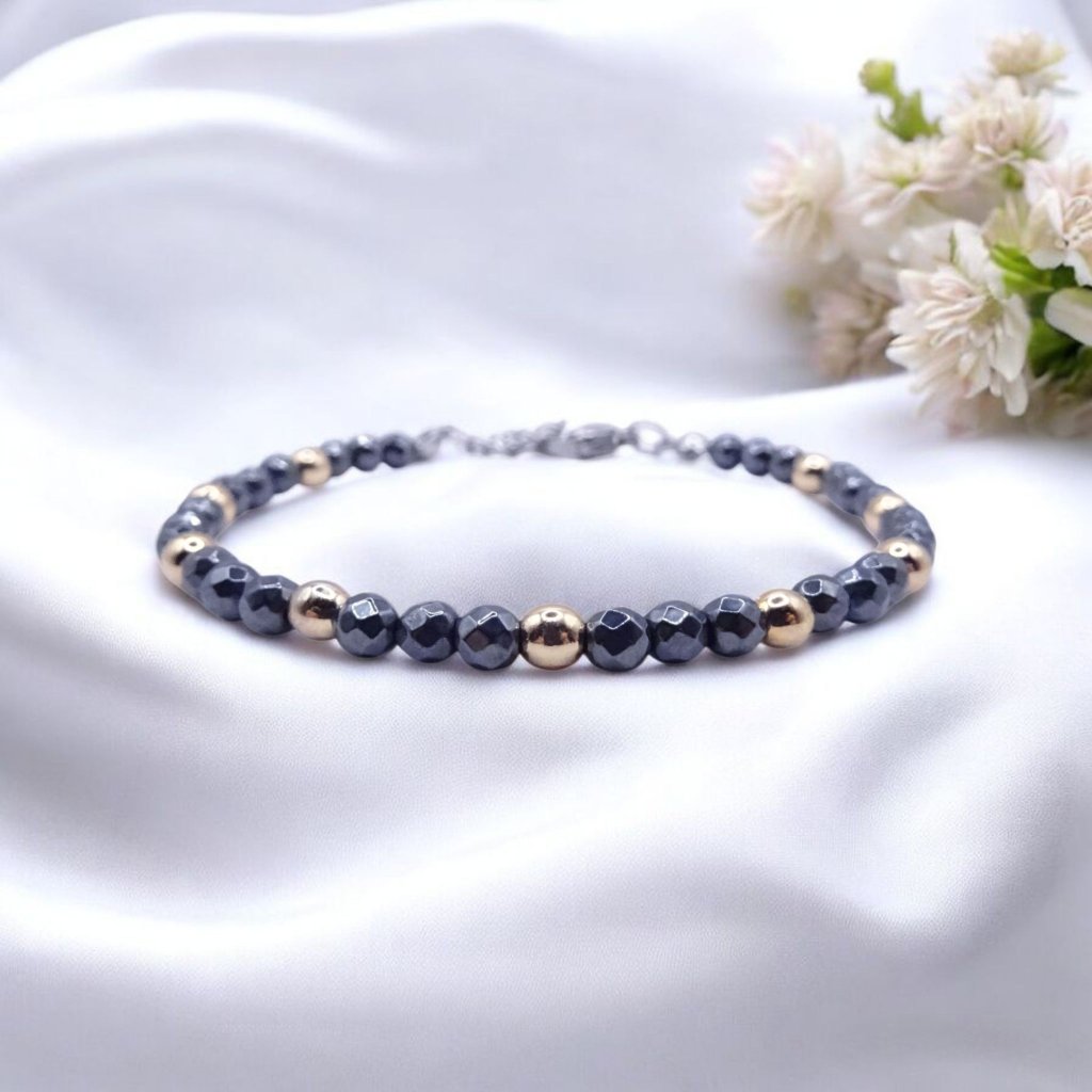 náramek z hematitu, dámský náramek z minerálů, černo-zlatý náramek, šperk z hematitu, ochranný náramek, náramek pro sílu a energii