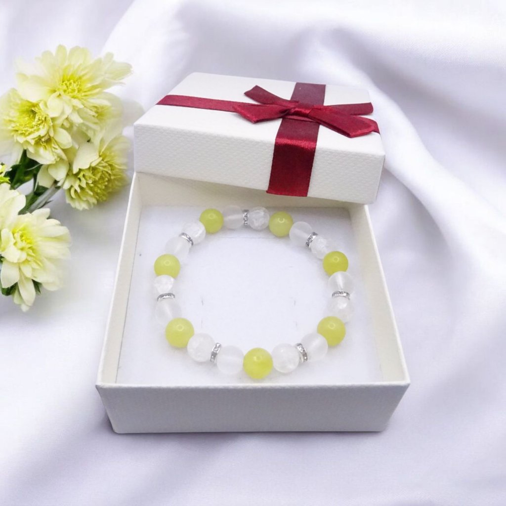 Krásný minerální náramek z křišťálu a jadeitu zaujme jemnou žluto-bílou kombinací, která působí svěže, něžně a velmi elegantně. Spojení citronově žlutého jadeitu a čistě bílého křišťálu vytváří originální design s jedinečným a harmonickým vzhledem. Náramek je navlečený na dvojité pružence, díky které si zachovává tvar, nevytahá se a pohodlně se nosí po celý den. Je ideálním doplňkem pro každodenní nošení i slavnostnější příležitosti.