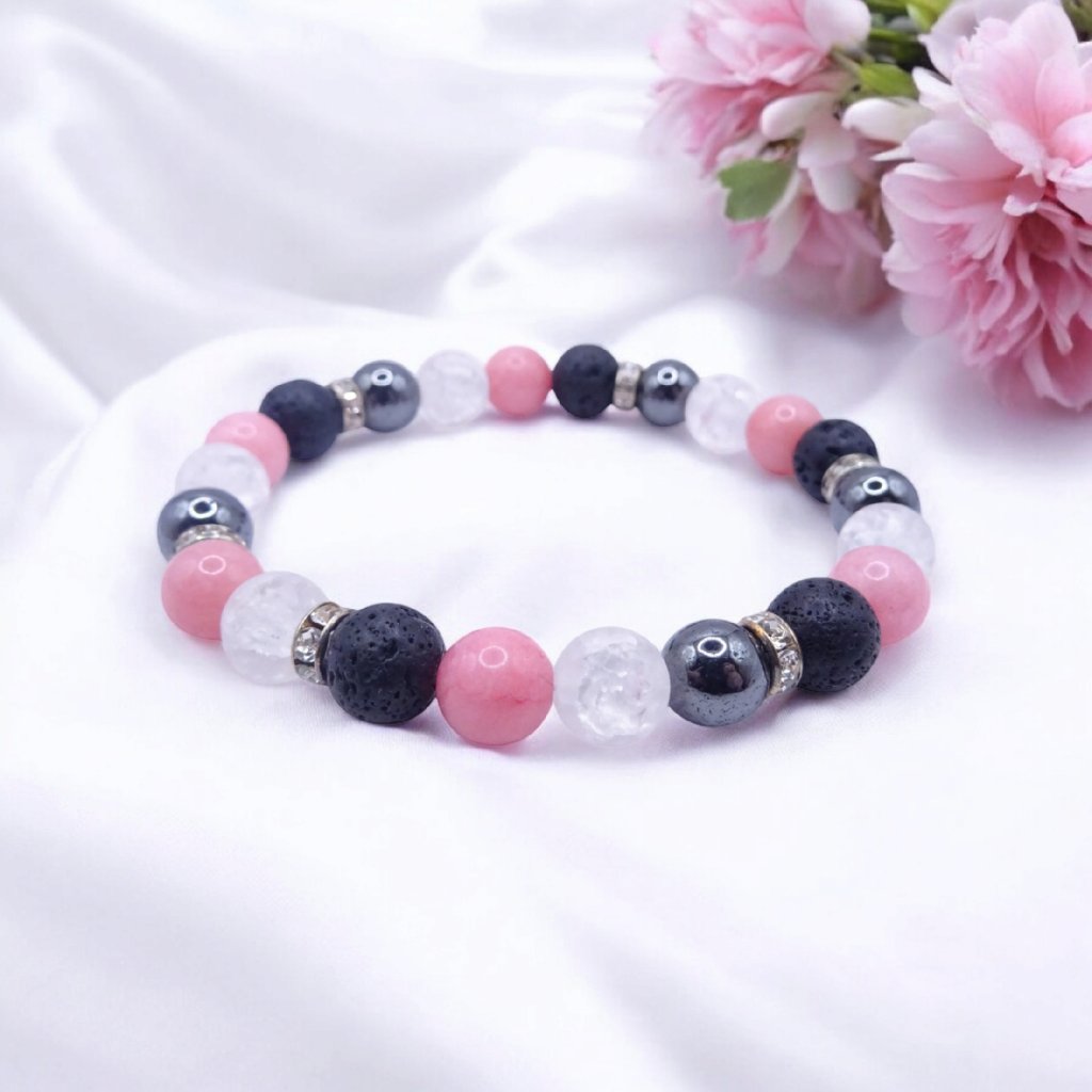 minerální náramek s lávovým kamenem, náramek s hematitem, náramek s jadeitem, náramek s křišťálem, dámský minerální náramek, růžovo-bílo-černý náramek, moderní náramek z minerálů, minerální náramek, náramek z minerálů