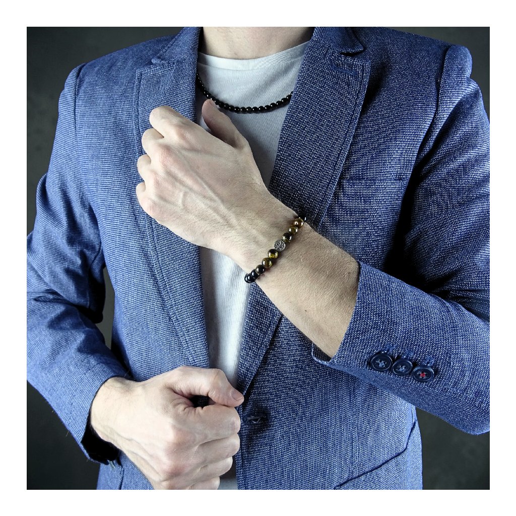 Pánský náramek z tygřího oka, hematitu a obsidiánu 8 mm – minerální náramek se stromem života