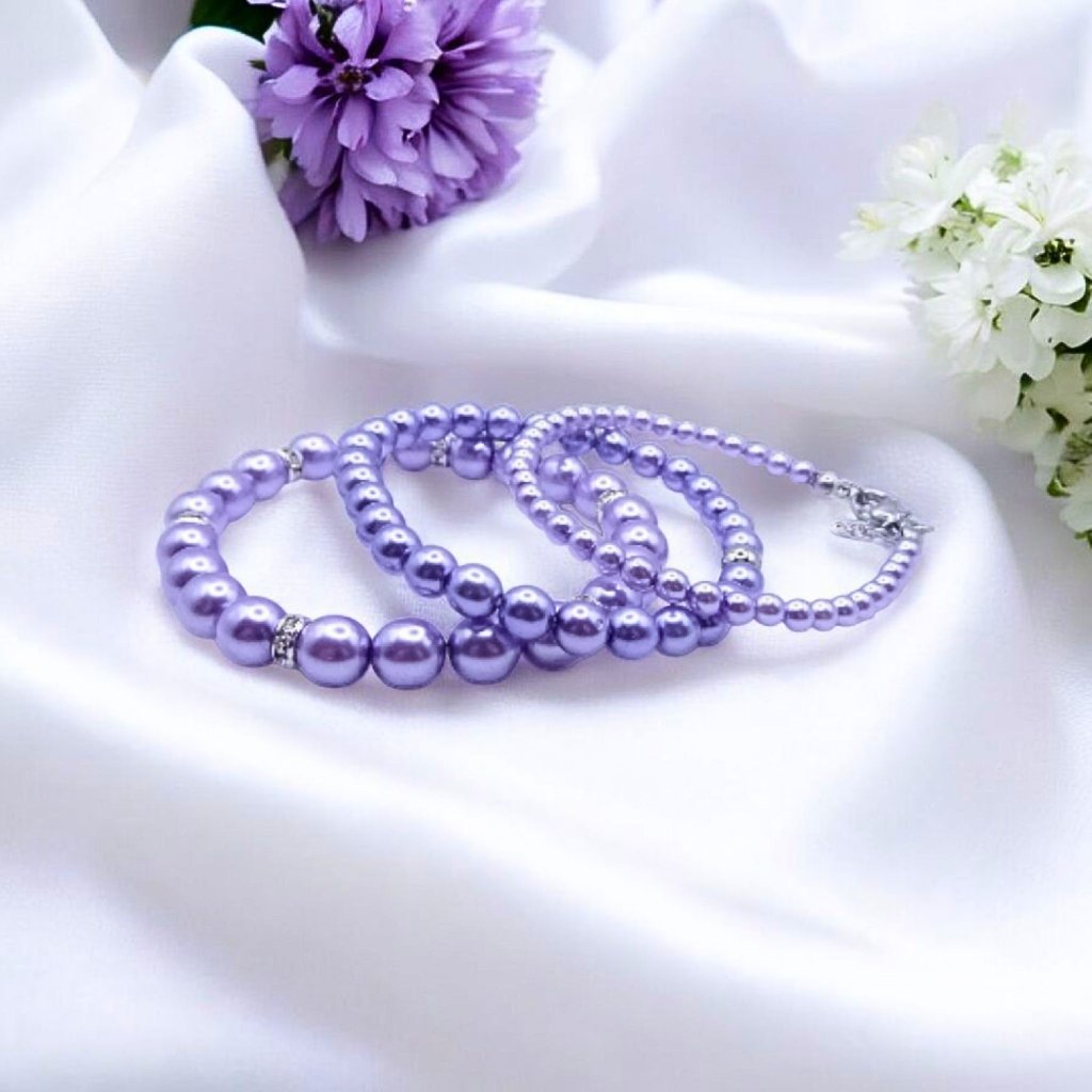 Tato elegantní sada tří fialových perličkových náramků