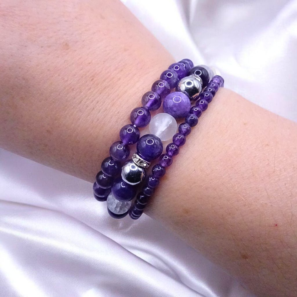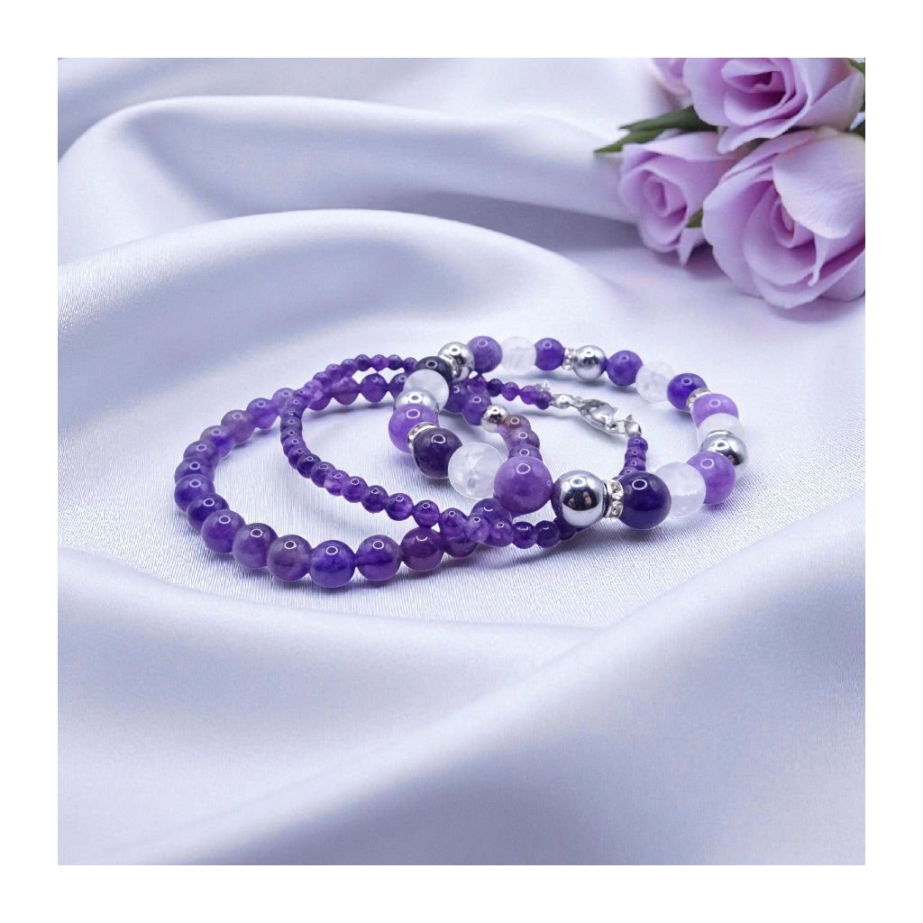 Tato elegantní sada tří náramků v jemné fialovo-bílo-stříbrné kombinaci přináší harmonii, klid a duchovní rovnováhu. Spojení ametystu, křemene, křišťálu a hematitu vytváří šperk, který působí luxusně, žensky a zároveň vyzařuje klidnou sílu. Ideální volba pro každodenní nošení i výjimečné okamžiky.