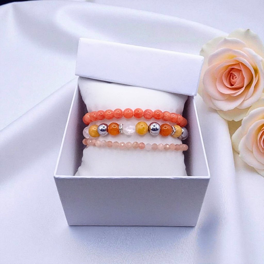Tato zářivá sada tří náramků v kombinaci oranžové, žluté a bílé přináší radost, energii a pozitivní náladu. Spojení jadeitu, hematitu, křišťálu a slunečního kamene vytváří šperk, který působí elegantně, živě a zároveň vyzařuje sílu, harmonii a optimismu. Ideální volba pro každodenní nošení i pro okamžiky, kdy chcete vyzařovat pozitivní energii.