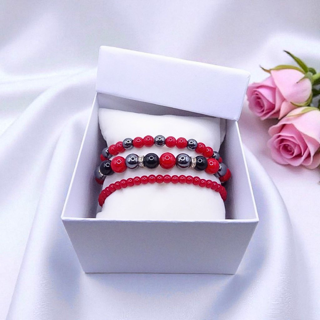 Tato elegantní sada tří náramků v působivé červeno-černé kombinaci symbolizuje sílu, odvahu a životní energii. Spojení jadeitu, hematitu a obsidiánu vytváří harmonii mezi vitalitou a ochranou – ideální doplněk pro sebevědomé osobnosti, které chtějí vyniknout a zároveň čerpat sílu z přírodních minerálů.