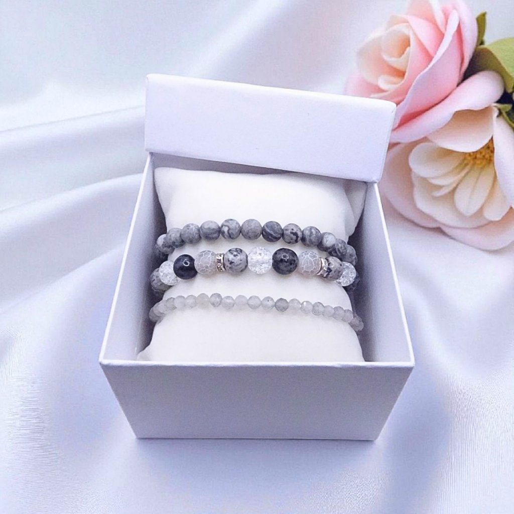 Tato elegantní sada tří náramků v odstínech šedé přináší rovnováhu, klid a sílu. Spojení jaspisu, labradoritu, křišťálu a šedého achátu vytváří šperk, který působí luxusně, moderně a zároveň vyzařuje vnitřní stabilitu a sebedůvěru. Ideální volba pro ty, kteří hledají harmonii, ochranu a nadčasový doplněk pro každý den.