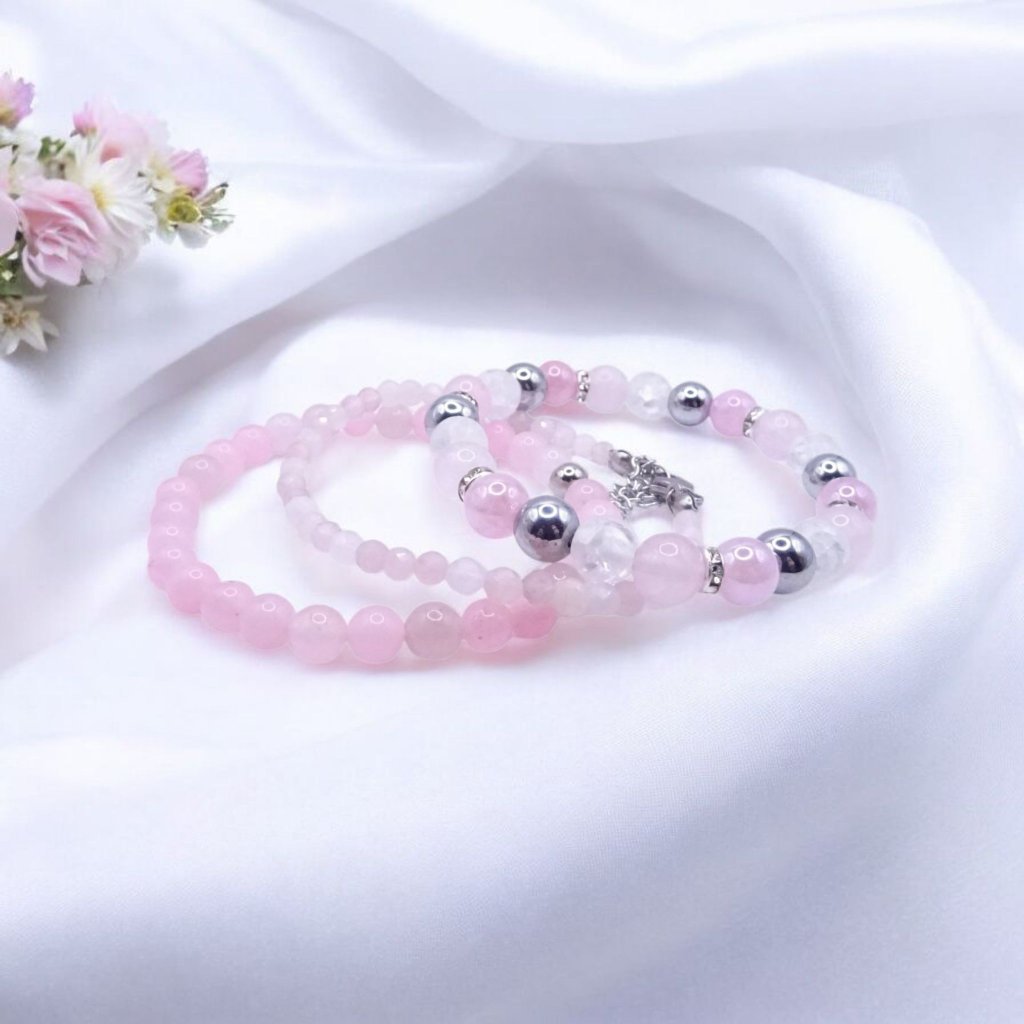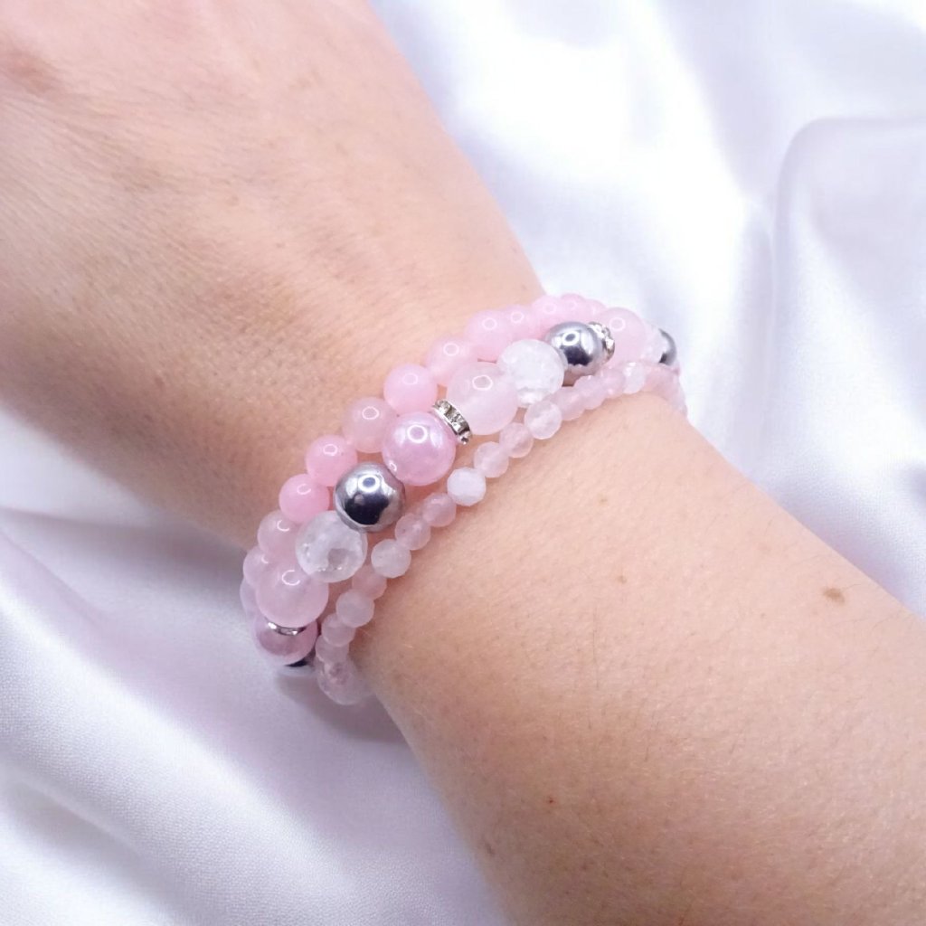 Náramek z korálků o průměru 8 mm v jemných tónech růžové, bílé a stříbrné. Spojuje energii čtyř kamenů pro vyváženou mysl i srdce. -