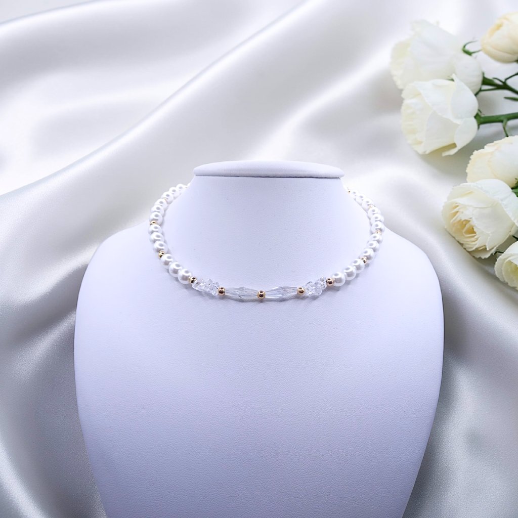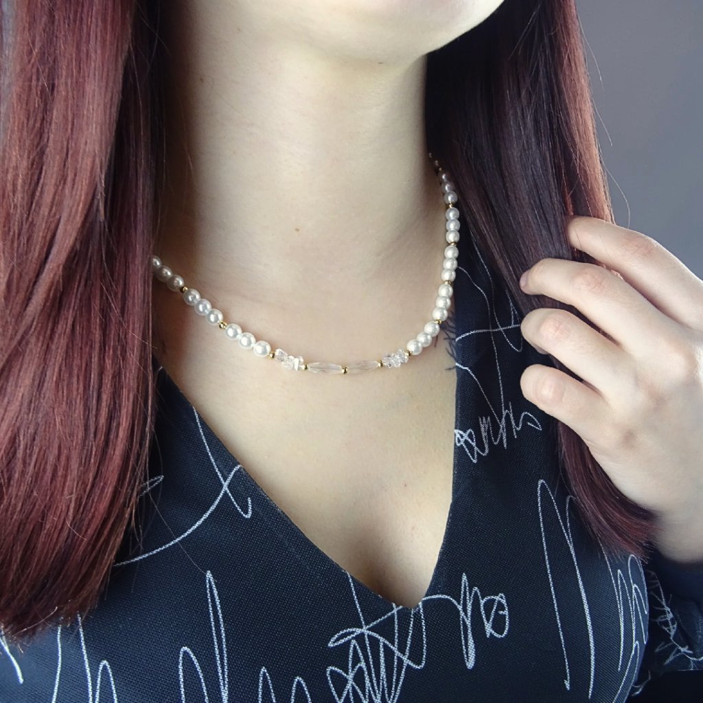 Elegantný, jemný a veľmi ženský dámsky náhrdelník CRYSTAL PEARL očarí svojou čistou farebnou harmóniou a nadčasovou krásou ✨🤍. Kombinácia bielych perličiek, drobných zlatých korálok a brúsených krištáľových korálok uprostred vytvára luxusný a veľmi vkusný šperk, ktorý pôsobí jemne, svetlo a mimoriadne elegantne.