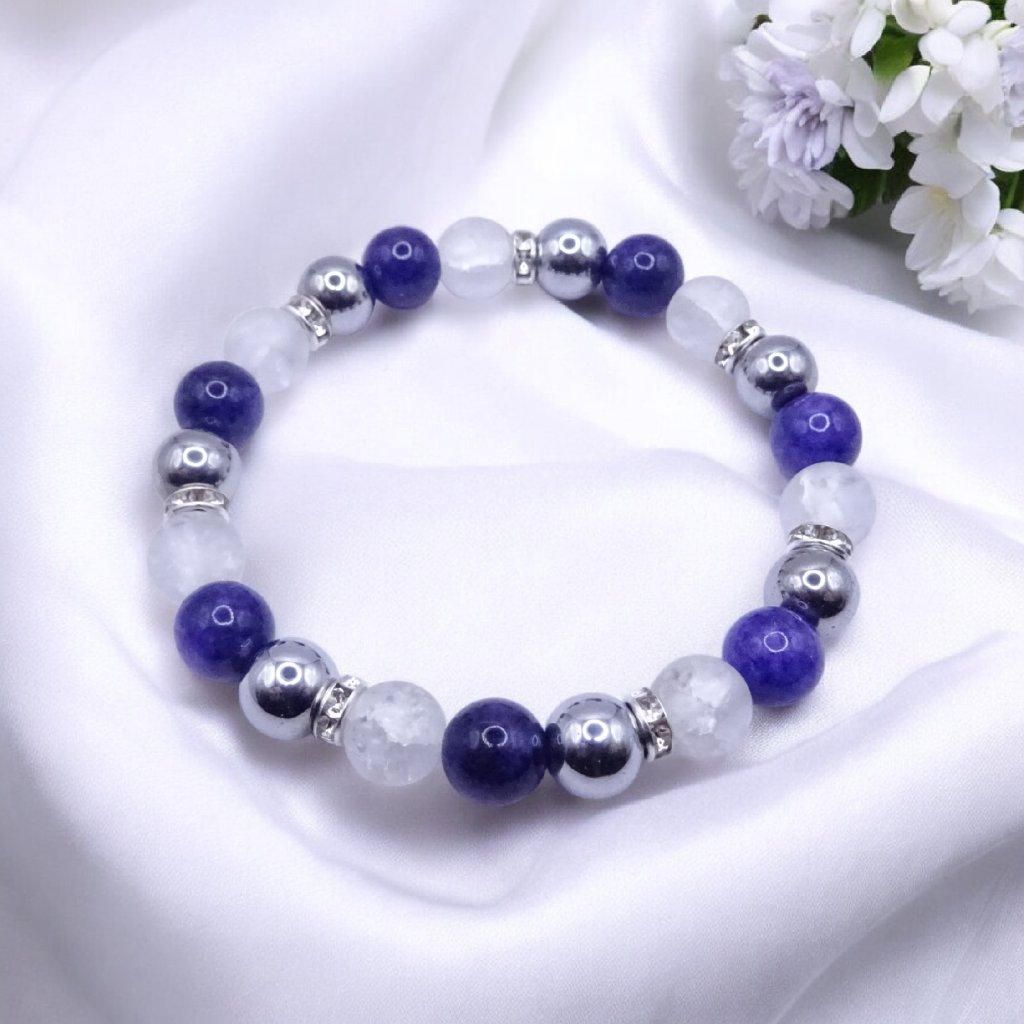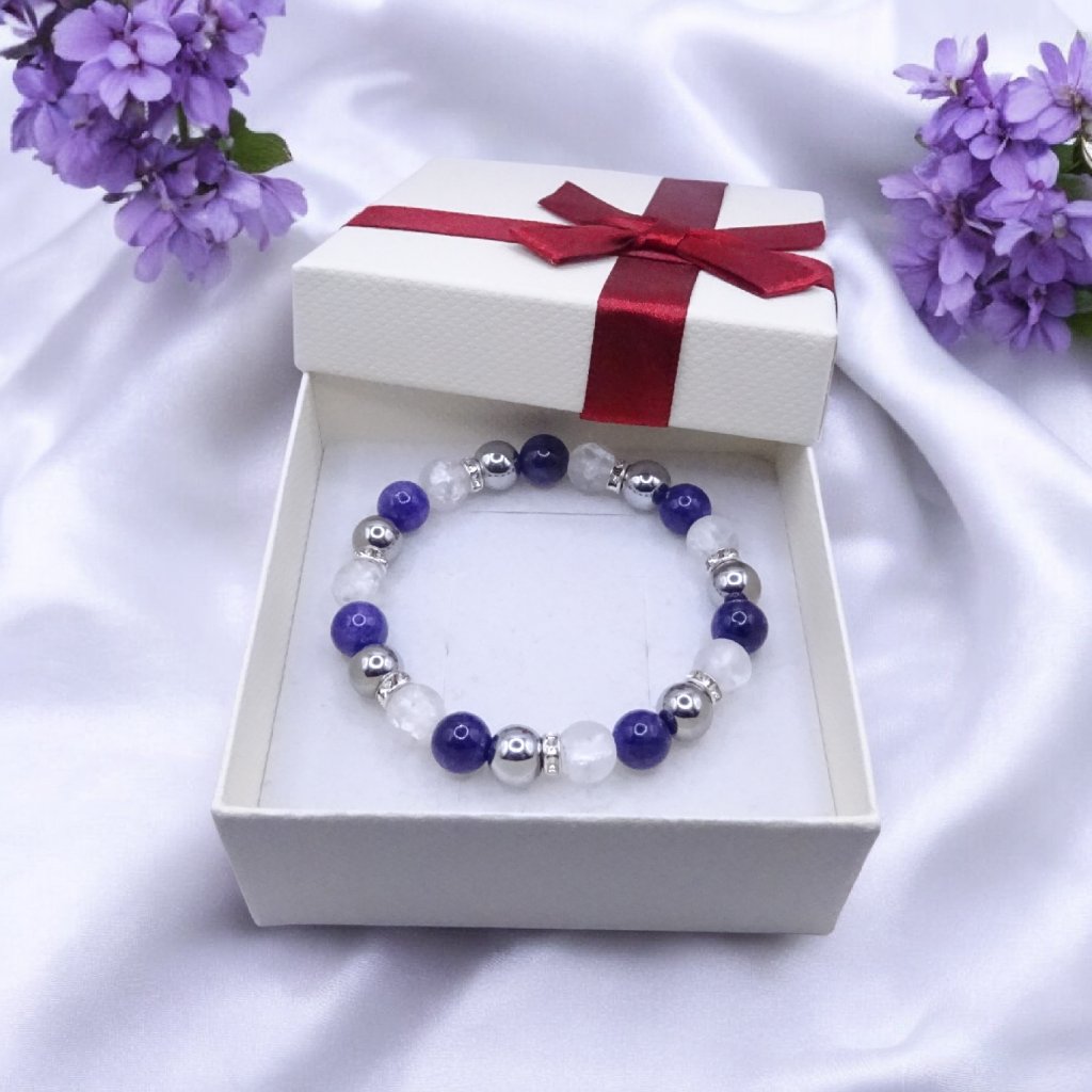 Objavte krásu a energiu minerálneho náramku z fialového kremeňa, krištáľu a hematitu, ktorý spája jemnosť, eleganciu a silnú ochrannú energiu. Nádherná fialovo-bielo-strieborná kombinácia pôsobí harmonicky, luxusne a nadčasovo. Tento náramok nie je len štýlovým doplnkom, ale aj sprievodcom na ceste k vnútornej rovnováhe a pokoju.