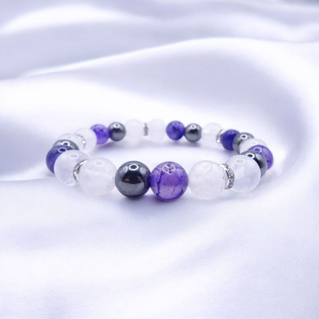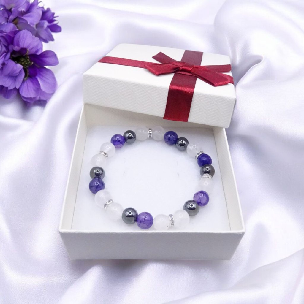 Krásny minerálny náramok z fialového achátu, krištáľu a hematitu 8 mm je navlečený na dvojitú pruženku, preto sa nevyťahá a pekne drží tvar. Aby Vám náramok správne padol, je treba zvoliť správnu veľkosť. Ako zvoliť správnu veľkosť náramku zistíte tu.