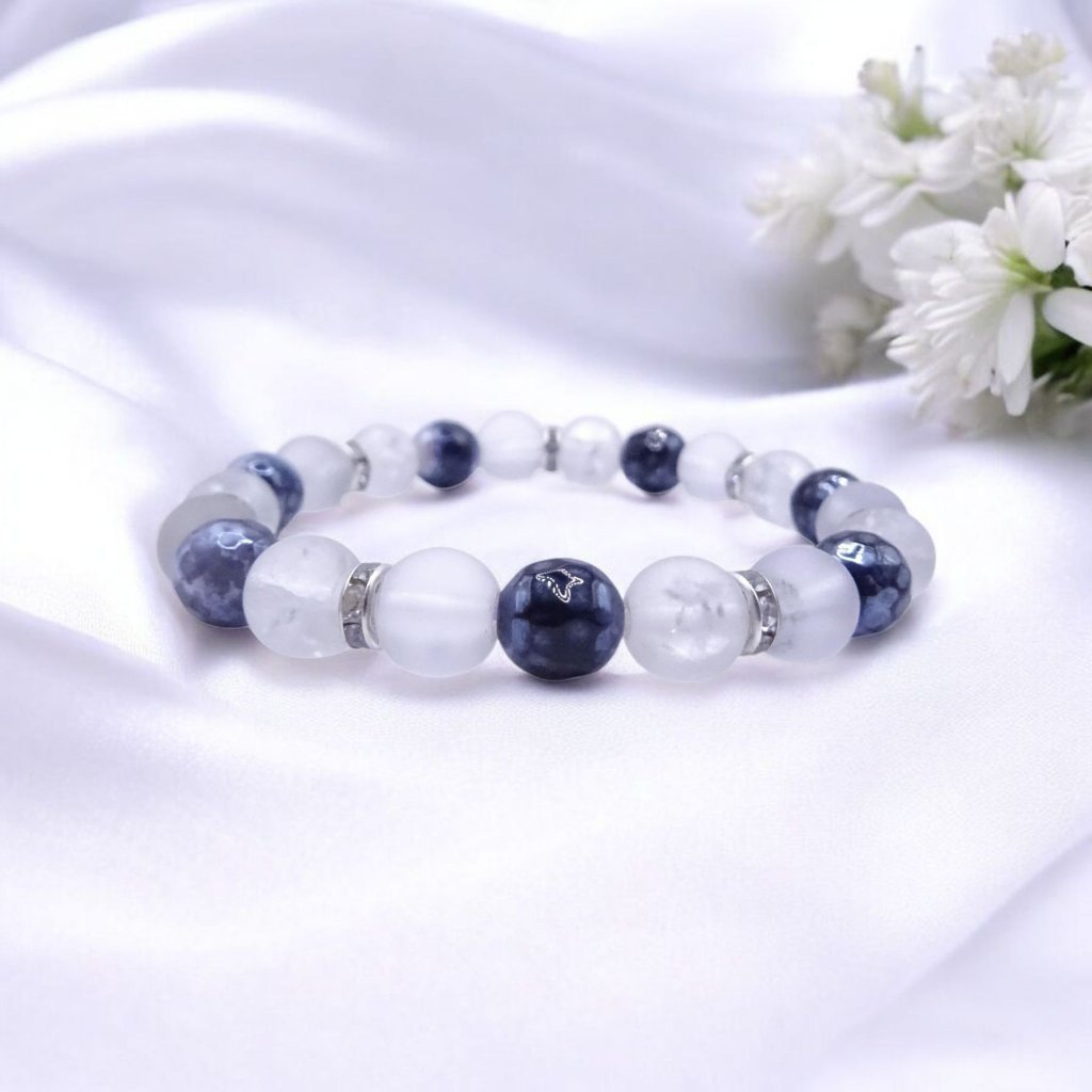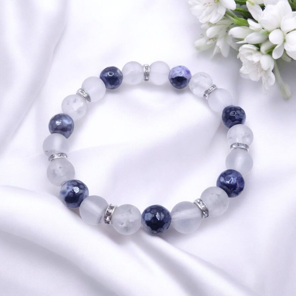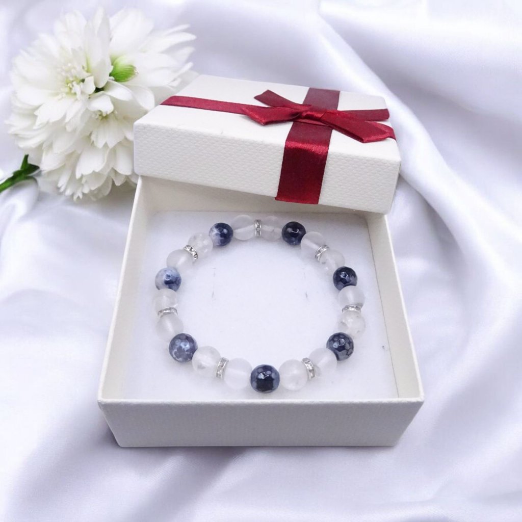 Krásny minerálny náramok z modrého brúseného achátu a krištáľu 8 mm je navlečený na dvojitú pruženku, preto sa nevyťahá a pekne drží tvar. Aby Vám náramok správne padol, je treba zvoliť správnu veľkosť. Ako zvoliť správnu veľkosť náramku zistíte tu.
