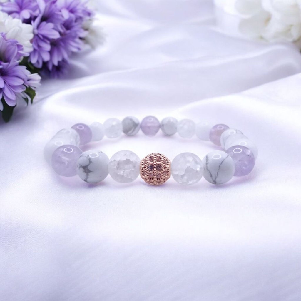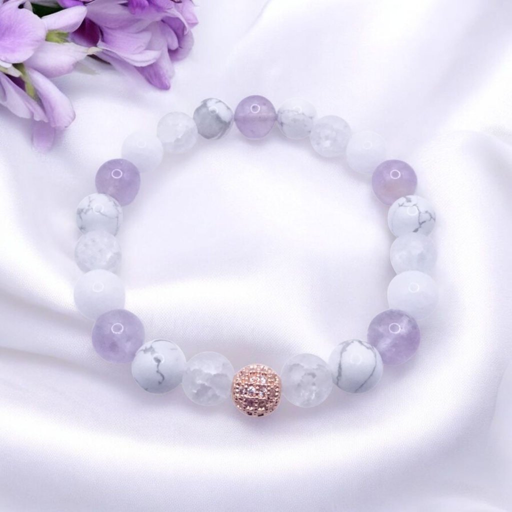 Krásny minerálny náramok z ametystu, krištáľu, jadeitu a magnezitu 8 mm je navlečený na dvojitú pruženku, preto sa nevyťahá a pekne drží tvar. Aby Vám náramok správne padol, je treba zvoliť správnu veľkosť. Ako zvoliť správnu veľkosť náramku zistíte tu.