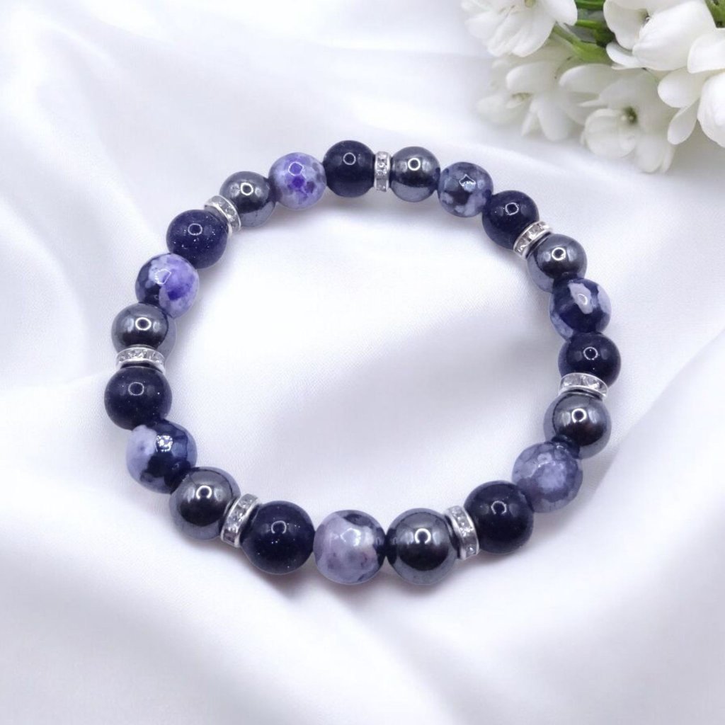 Krásny minerálny náramok z modrého avanturínu, modrého brúseného achátu a hematitu 8 mm je navlečený na dvojitú pruženku, preto sa nevyťahá a pekne drží tvar. Aby Vám náramok správne padol, je treba zvoliť správnu veľkosť. Ako zvoliť správnu veľkosť náramku zistíte tu.