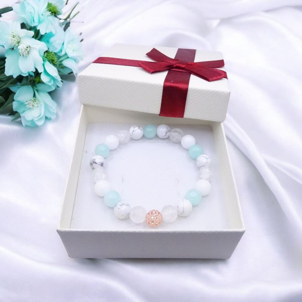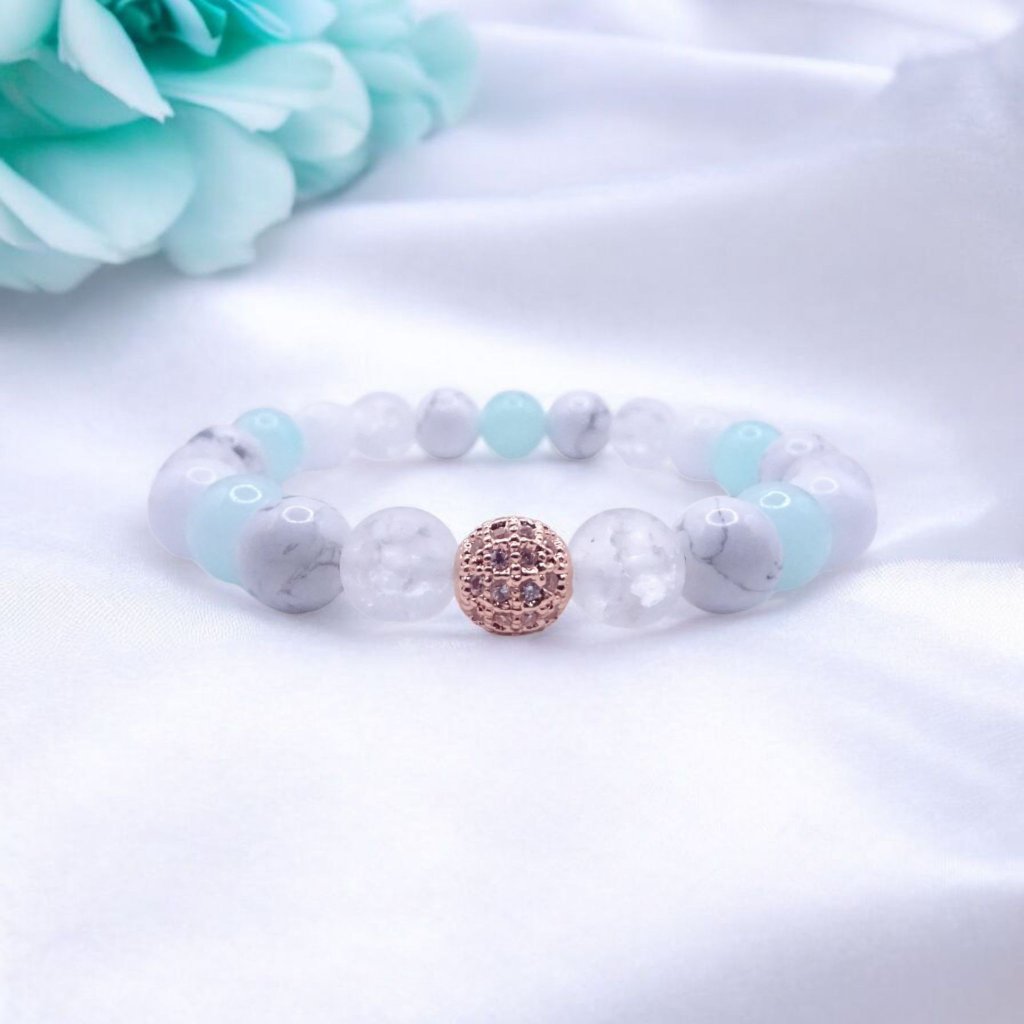 Krásny minerálny náramok z chalcedónu, krištáľu, jadeitu a magnezitu 8 mm je navlečený na dvojitú pruženku, preto sa nevyťahá a pekne drží tvar. Aby Vám náramok správne padol, je treba zvoliť správnu veľkosť. Ako zvoliť správnu veľkosť náramku zistíte tu.