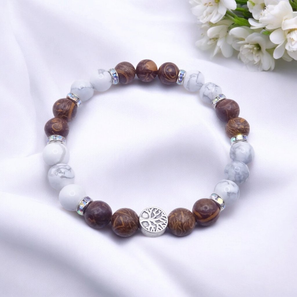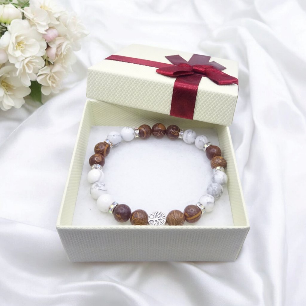 💫 Tento minerálny náramok v prírodnej hnedo-bielej kombinácii so Stromom života je ideálnou voľbou pre ženy, ktoré obľubujú symbolické a prírodné šperky.
