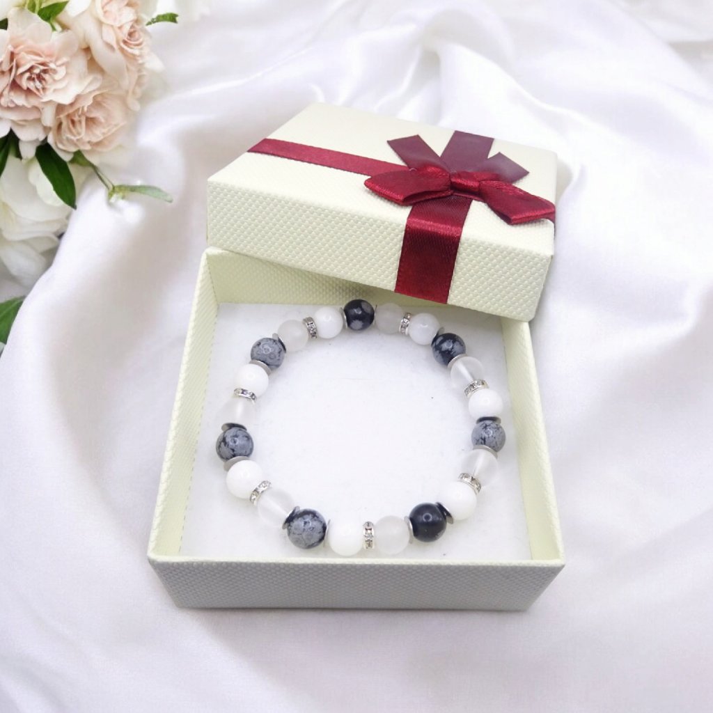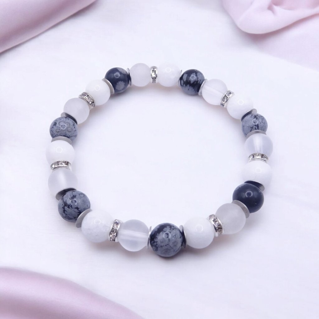 Krásny minerálny náramok z krištáľu, jadeitu a vločkového obsidiánu 8 mm je navlečený na dvojitú pružinku, preto sa nevyťahá a pekne drží tvar. Aby Vám náramok správne padol, je treba zvoliť správnu veľkosť. Ako zvoliť správnu veľkosť náramku zistíte tu.